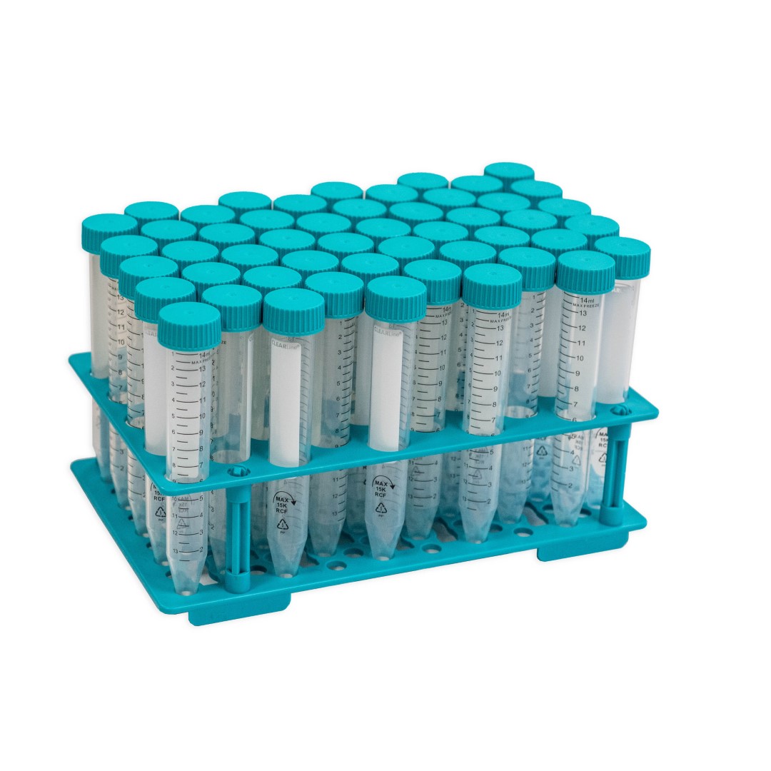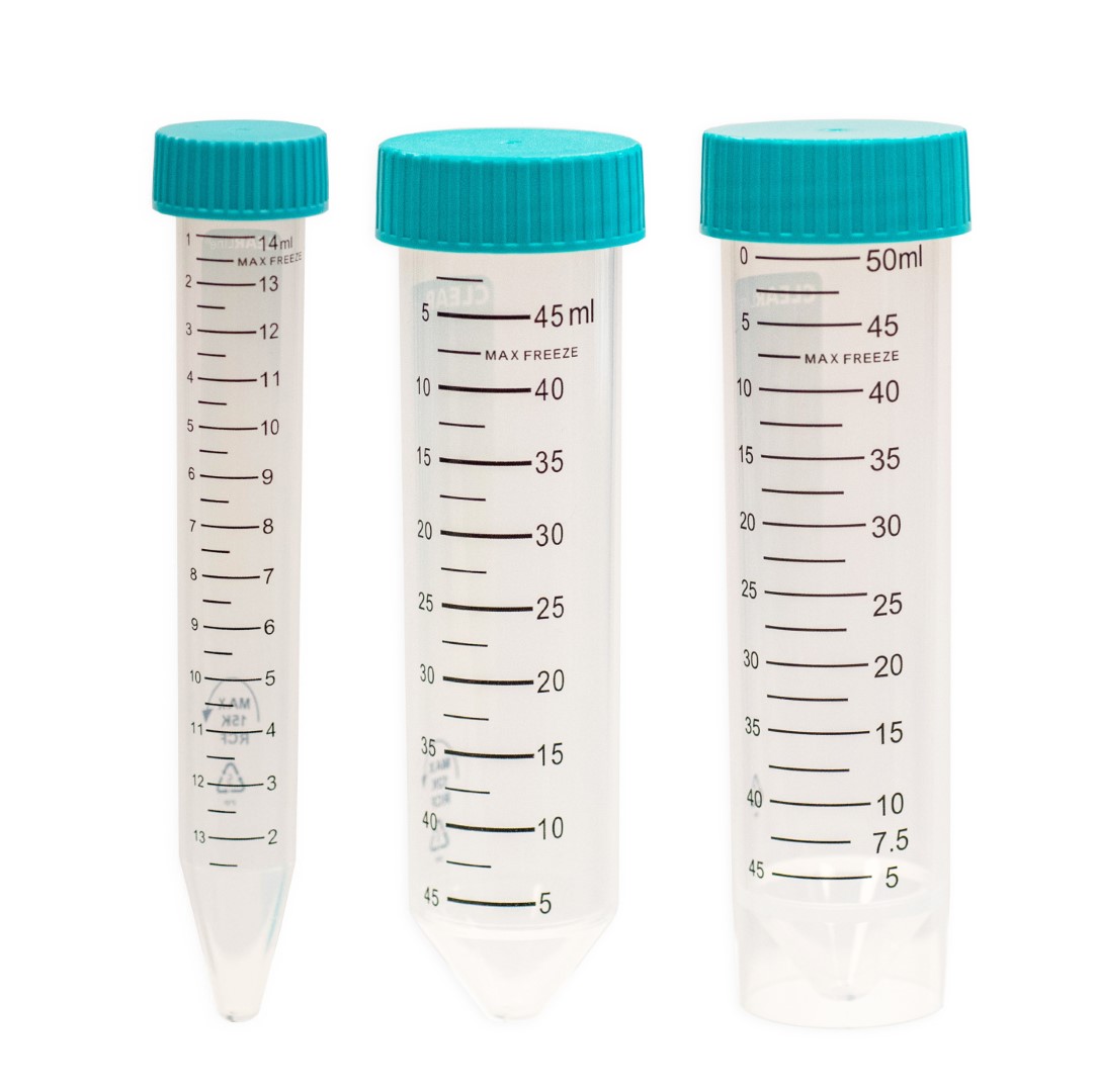 Стерилна центрофужна епруветка от високопрозрачен полипропилен (PP) с винтова капачка от полиетилен (PE).