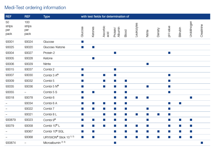 Тест ленти за урина за определяне на единадесет показателя - Аскорбинова киселина, Билирубин, Кръв, Плътност, Глюкоза, Кетони, Левкоцити, Нитрити, pH, Протеин, Уробилиноген