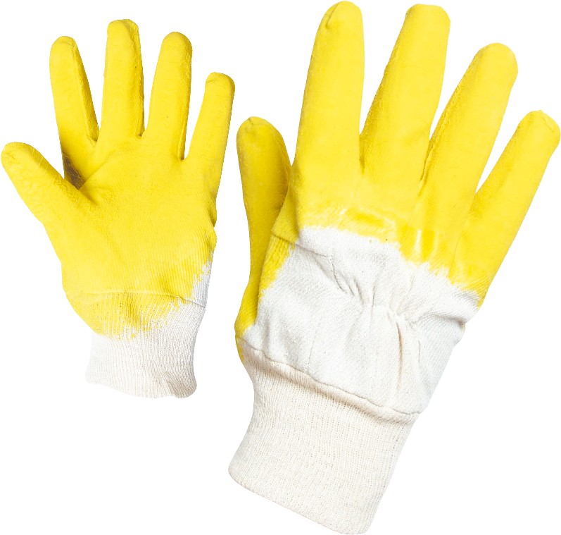Ръкавици с пет пръста, изработени от безшевно, плетено памучно трико, пръсти и длан топени в латекс, дишащ гръб, с ластичен маншет. Ръкавиците са подходящи за работа с химични реактиви, товаро-разтоварна работа и други работни дейности.