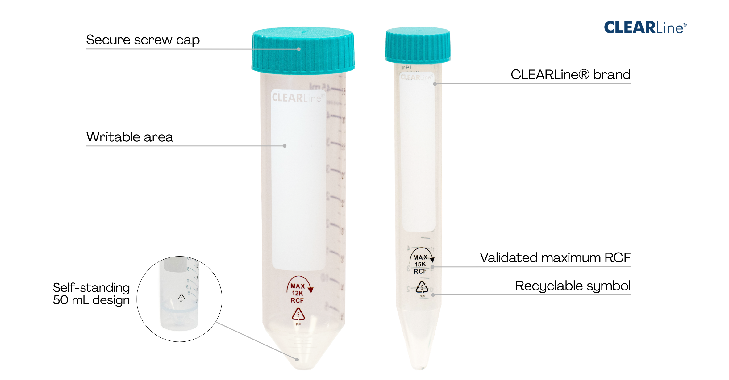 Стерилна центрофужна епруветка от високопрозрачен полипропилен (PP) с винтова капачка от полиетилен (PE).
