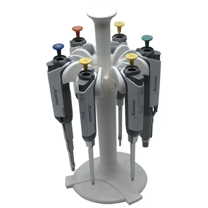 Когато пипетата не се използва е за предпочитане да се съхранява в изправено положение, за да се избегне замърсяване на мръсни работни плотове. Тази стойка тип „въртележка“ може да побере до 6 микропипети Accumax FAB.