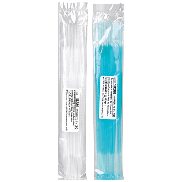 Polystyrene. Sterile bags. With precisely measured loop at one end and needle at the other. |Inert plastic. Ideal for inoculating culture media.
